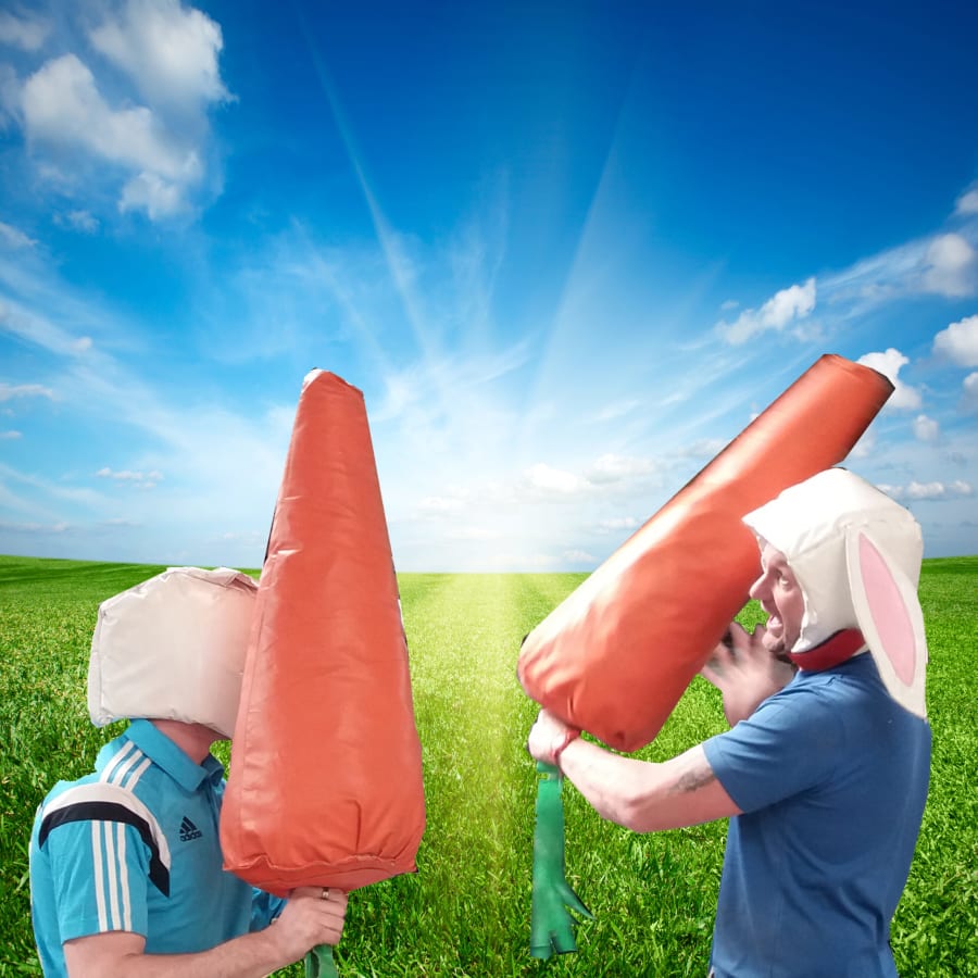 Our Easter Bash is an exciting twist on the classic Pole Joust game. Instead of the usual Pugil Sticks or Pillows, gear up with our whimsical Carrot Bashers and Floppy Ear Bunny Hats. This one-of-a-kind setup promises endless giggles and a healthy dose of competition, making it a fantastic choice for all ages.